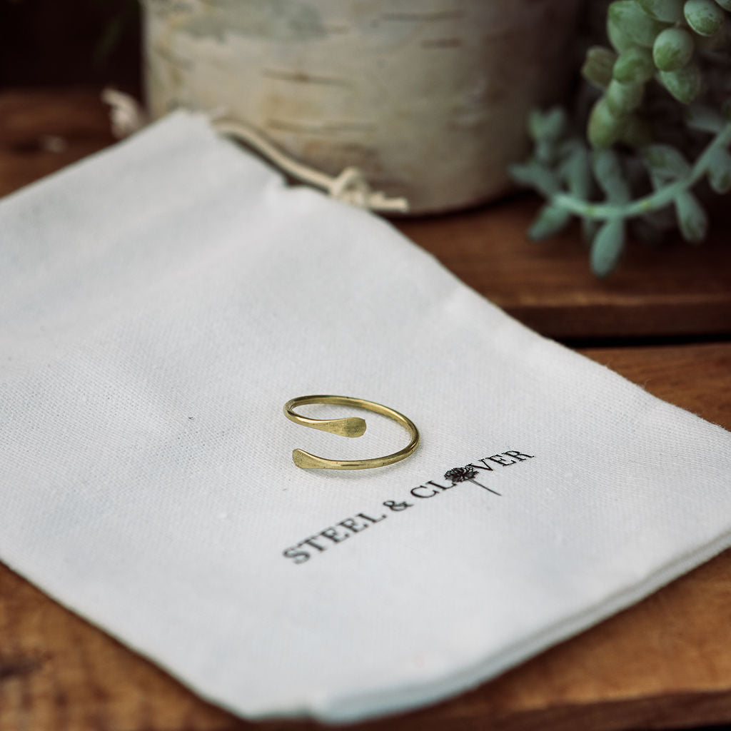 Due to the overwhelming love for our Smoky River Brass Bracelet, we've created the Smoky River Brass Ring to complete the set. With its rustic texture and warm golden hue, this ring exudes natural charm while embracing a simple design. Crafted from quality brass and designed to be adjustable, it effortlessly fits any finger, making it a versatile accessory for any occasion.