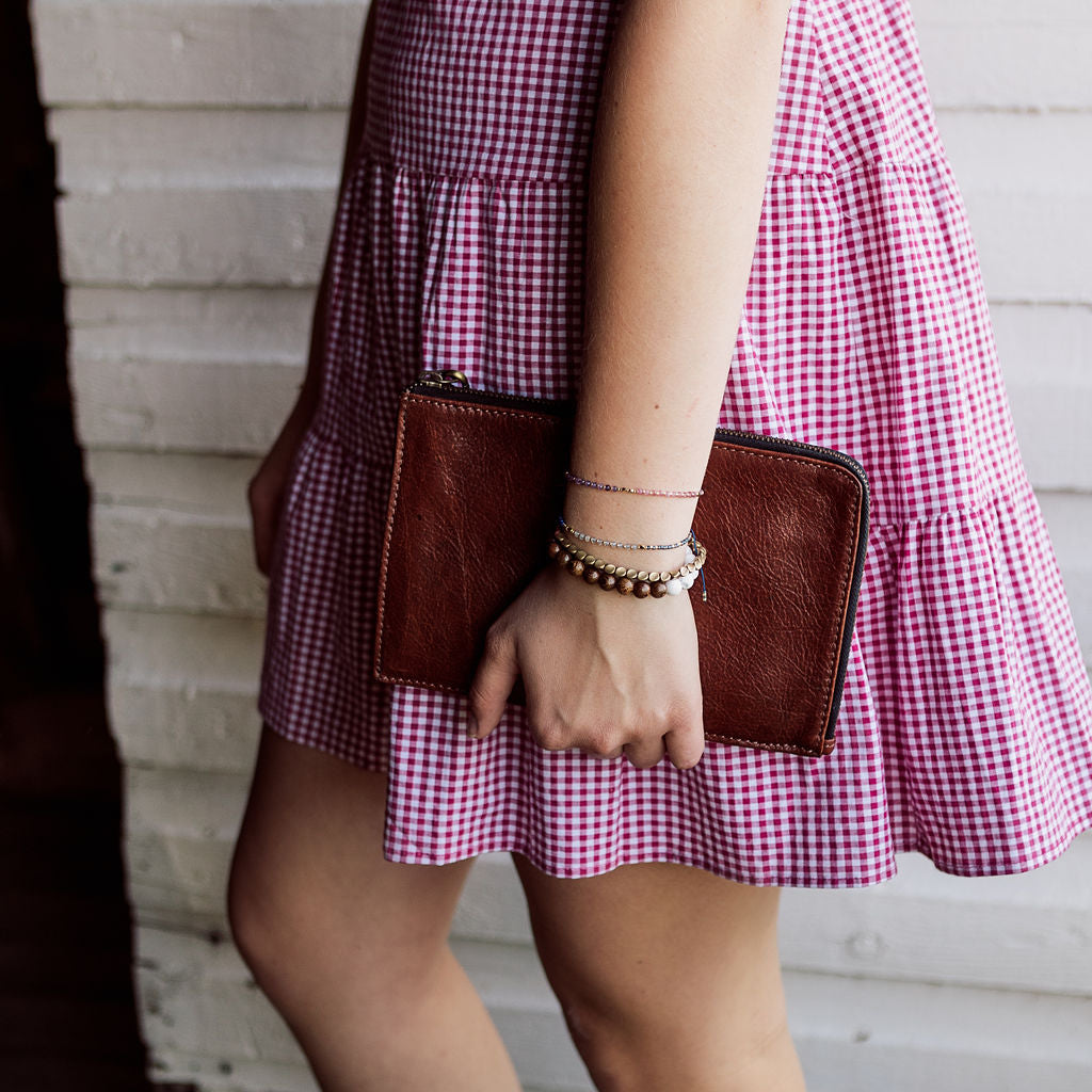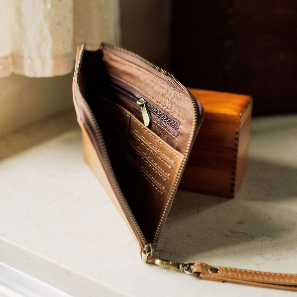 All you need and nothing more! The Goodwin wristlet wallet was inspired by our previous Nampa wallet, but with a retro twist. Boasting the same Argentinian leather and brass hardware finishes, but with an elongated zipper to allow for easier access to coins and cards. This retro design provides for the simple organization of your cash, receipts, cards and coins and still leaves room for your phone and a small key ring. The Goodwin wallet allows you to keep all your valuables tucked in close while still allowing you to go about the demands of life hands free.