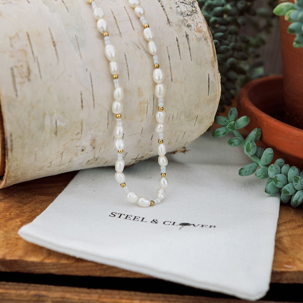 Embodying the perfect balance of refined elegance and prairie simplicity, the Girouxville Pearl Bead Necklace is crafted with irregular freshwater pearls. Each pearl tells a unique story of nature’s artistry complemented by simple white and gold beads for a touch of subtle sophistication.